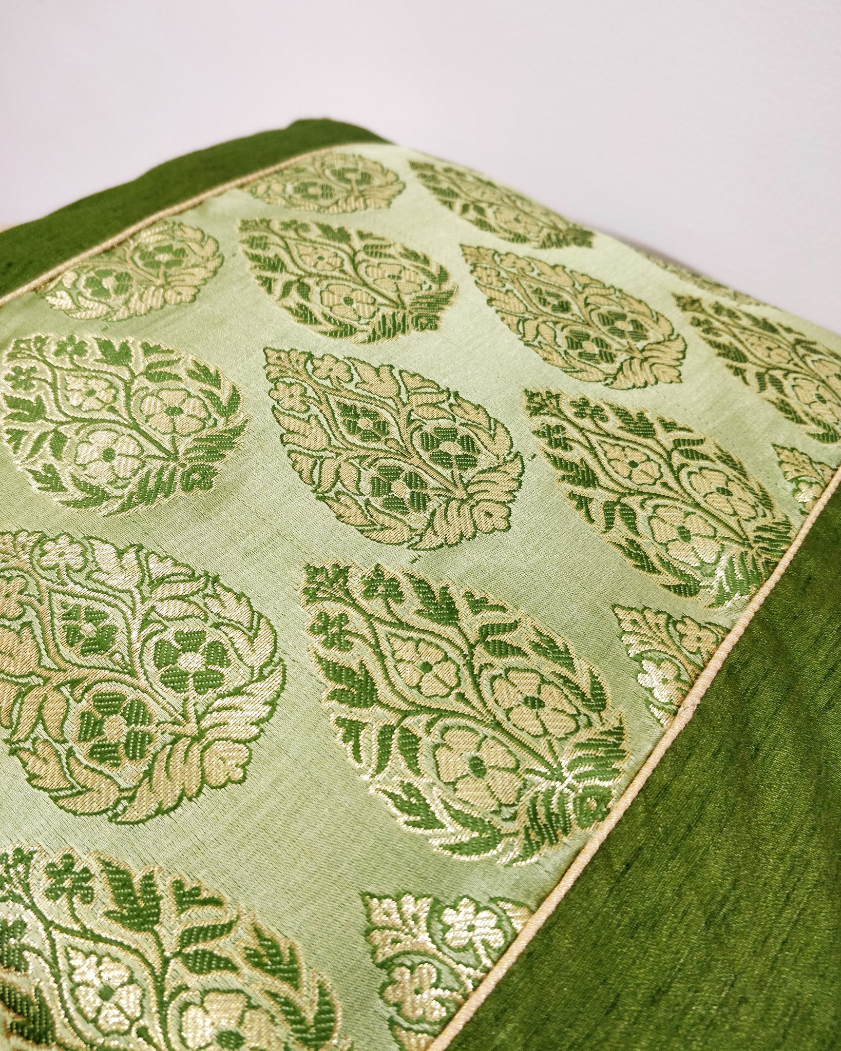 Olive garden brocade cushion cover would be a great home decor piece to add a traditional touch to your living space.