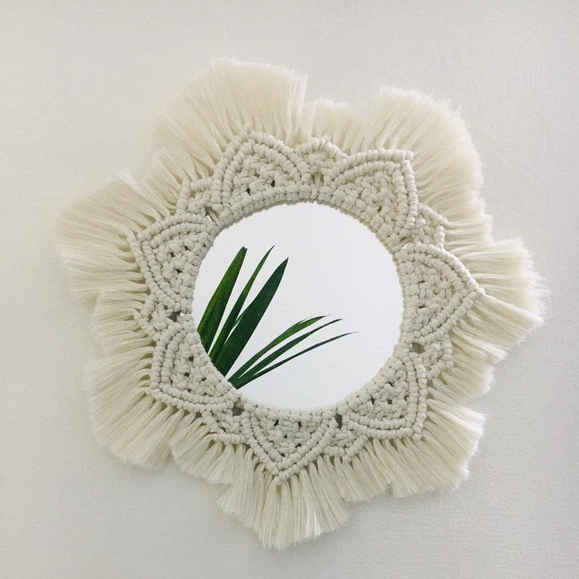 Bring your space to the next level with this handmade macrame mirror. Every cotton cord is hand cut and woven to make this beautiful mandala style piece. Adorn a wall in your bedroom, entryway, or even the children's room with its whimsical and playful design. It is just as much a functional mirror as it is a statement piece of wall art. Its neutral color allows it to work in any space, fitting in seamlessly.