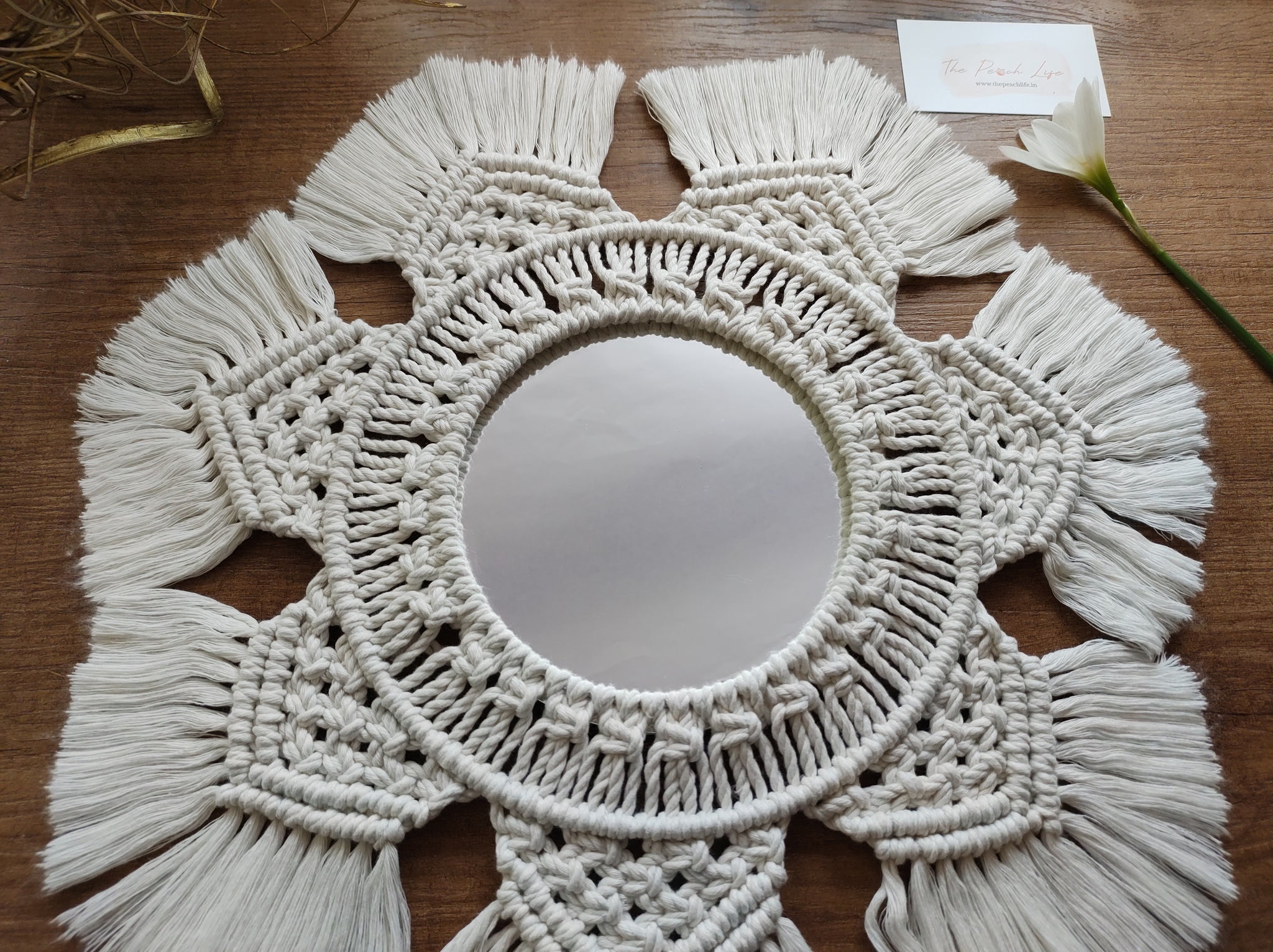 Bring your space to the next level with this handmade macrame mirror. Every cotton cord is hand cut and woven to make this beautiful mandala style piece. Adorn a wall in your bedroom, entryway, or even the children's room with its whimsical and playful design. It is just as much a functional mirror as it is a statement piece of wall art. Its neutral color allows it to work in any space, fitting in seamlessly.